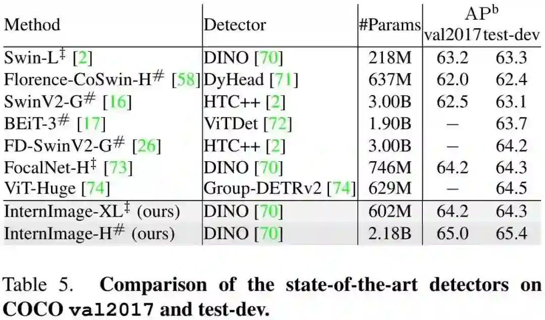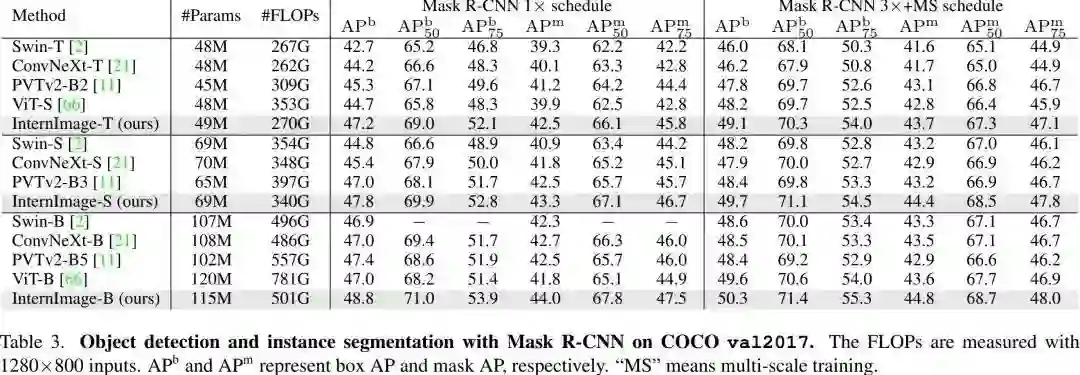 不同于近来聚焦于大核的CNN方案,InternImage以形变卷积作为核心操作(不仅具有下游任务所需的有效感受野,同时具有输入与任务自适应空域聚合能力)。所提方案降低了传统CNN的严格归纳偏置,同时可以学习更强更鲁棒的表达能力。ImageNet、COCO以及ADE20K等任务上的实验验证了所提方案的有效性,值得一提的是:InternImage-H在COCO test-dev上取得了新的记录65.4mAP。