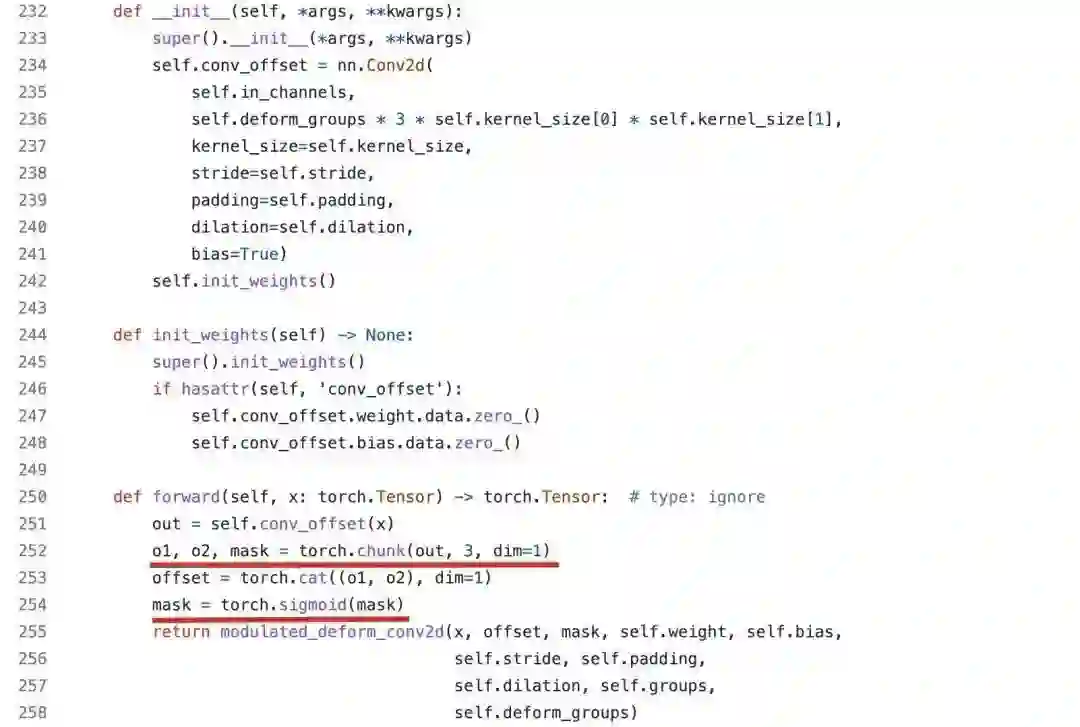 在代码方面,作者尚未开源,不过相比DCNv2,DCNv3更多是体现在引入新机制,如调制因子生成方式、多组机制、规范化方式。可基于MMCV的扩展算子ModulatedDeformConv2dPack进行简单的说明,见下图。DCNv2中的调制因子与偏移通过conv_offset统计计算得到,而调制因子mask采用的是sigmoid激活。而DCNv3则采用depth-wise计算mask,采用point-wise计算offset,通过该操作可以一定程度减少模型参数量。至于sigmoid到softmax的迭代在实现上就更容易了。最后,说一点:DCNv2实际上已经有了多组(见deform_groups)的概念,应该不算是本文新引入的吧。