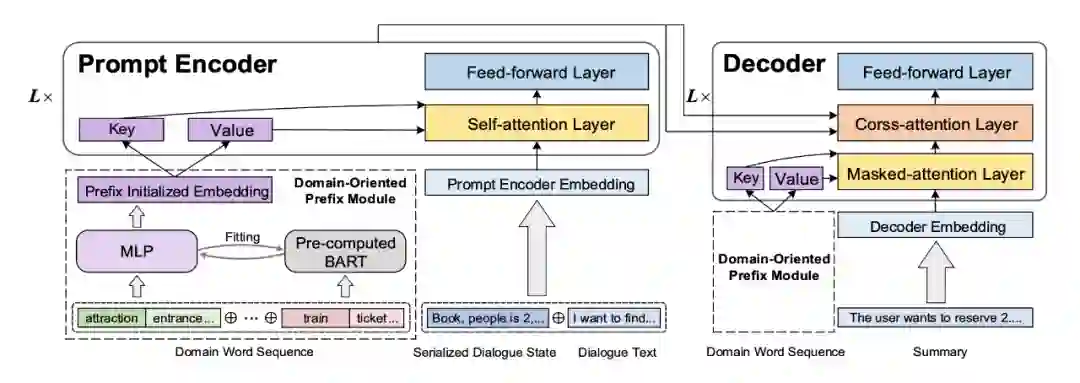 模型结构包括 Domain-Oriented Prefix,Prompt Encoder 以及 Decoder 三个部分。
