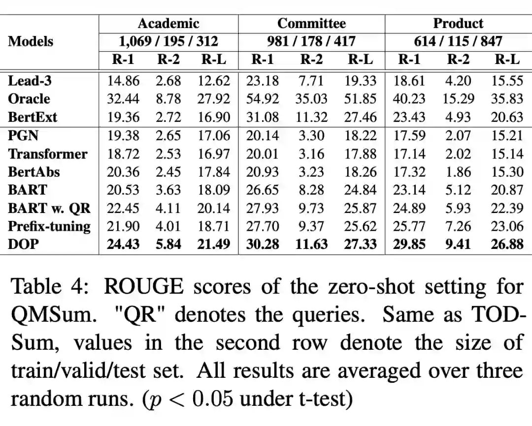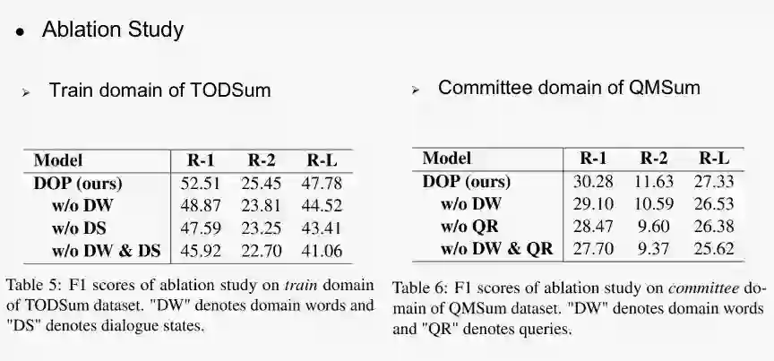 整体表现的趋势与在 TODSum 数据集上的表现一致,但是可以看出在 Rouges 的分数相对而言较低,是因为领域并没有明显的领域词,导致了严重的领域耦合的问题。除此之外,由于会议文本过长,很难从对话中捕捉核心内容。总的来说,这些结果表明多领域设置对于会议摘要是非常必要且有意义的。