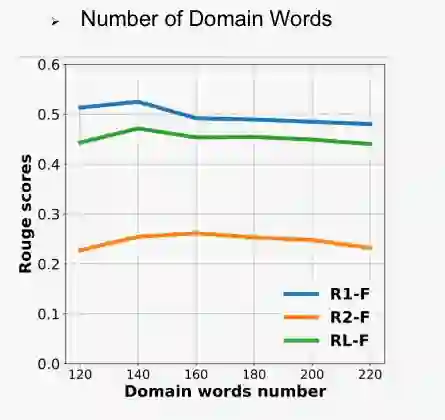 探究领域词数量的影响,可以看到领域词数量在 140 时使 rouge 达到了峰值,当低于 140 时,效果降低,说明参数量不足影响了模型的表现。当领域词数量超过阈值时,模型的表现下降,说明了太长的 prefix 序列给 BART 增加了负担,并且引入了额外的噪声。但是,领域词数量的变化并没有对模型的表现的有太大的影响(只有 2~3% 的起伏),说明了 domain-oriented prefix 模块和有效性和模型的鲁棒性。