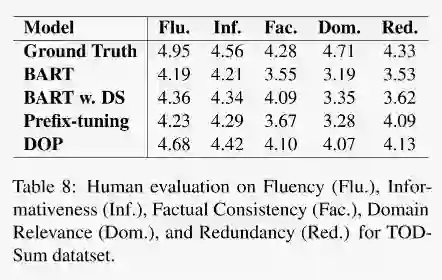 表中显示,所有模型的流畅程度都较高,说明在较强的 backbone 上微调的抽象摘要模型能够生成更流畅的句子。在事实一致性上,DOP 以及 BART ws DS 好于 Prefix-tuning 的表现,说明对话状态信息能引导模型更关注与核心的信息,例如槽值和意图。初次之外,DOP-tuning 在领域相关性上的表现超过了其他基线模型。说明了 domain-oriented 模块在提升模型识别领域相关特征以及从源域和目标域解藕出知识的能力。