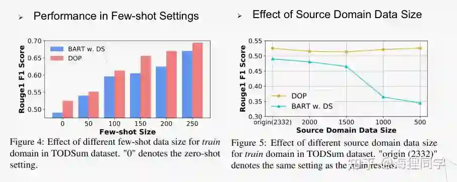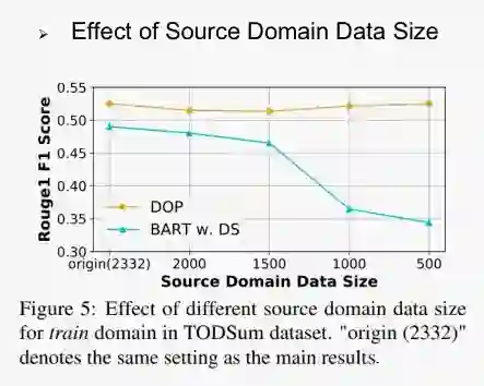 对于 TODSum 数据集,固定源域的数据规模,将目标域的数据加入训练数据。可以看到随着目标域数据的增加,BART w. DS 和 DOP 的表现提升,但 DOP-tuning 始终好于 BART w. DS. 说明目标域的知识增加可以让模型学到目标域的信息。