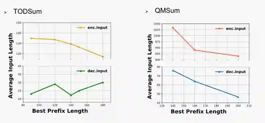 一个有趣的现象是移除 encoder 的 prefix 的影响要小于移除 decoder 的 prefix 的影响。一个比较合理的解释是在 encoder 和 decoder 端的 prefix 的作用是不一样的。在 encoder 端的 prefix 主要帮助模型理解对话,而 decoder 端的 prefix 主要帮助模型生成。因此,对于摘要生成,decoder 端的 prefix 模块对模型更有用。