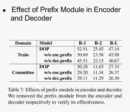 由于 DOP-method 在 encoder 和 decoder 中均引入了 prefix 模块,研究两个部分的 prefix 模块对模型表现的影响。可以看到,当两个部分的 prefix 被移除后,模型的表现均下降,说明了两个模块的 prefix 都是必要且高效的。