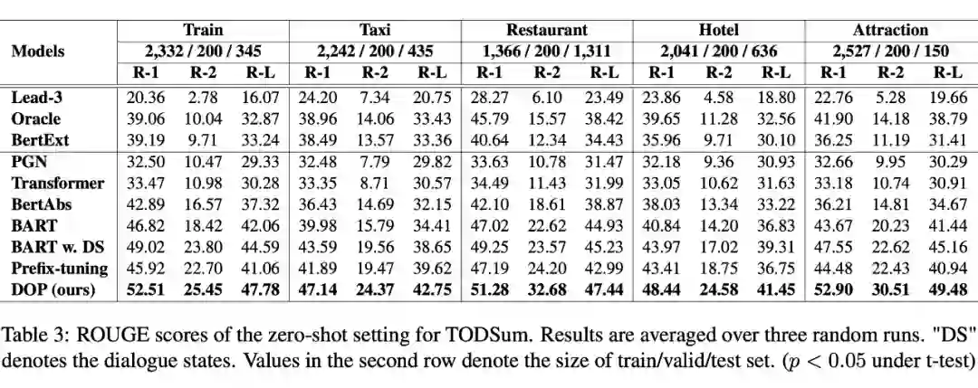 可以看到,Prefix-Tuning 相比较 BART,BART w. DS., 表现要差,是因为对话文本很长且复杂,仅使用 fine-tuning 参数的 20% 很难理解领域知识,以及识别对话中的关键内容。在与 Prefix-tuning 具有相同量级的参数下,DOP- tuning 在 5 个领域都有了较大的提升。这表明由领域词初始化的 prefix 模块以及有对话状态组成的离散的 prompts 发挥了重要的作用。除此之外,模型比全参数 fine-tuning 的模型 BART 要好,说明模型可以有效地从源域和目标域中解藕出知识。上述结果表示,在有限的数据情况下,模型仍然可以达到 SOTA 的结果。