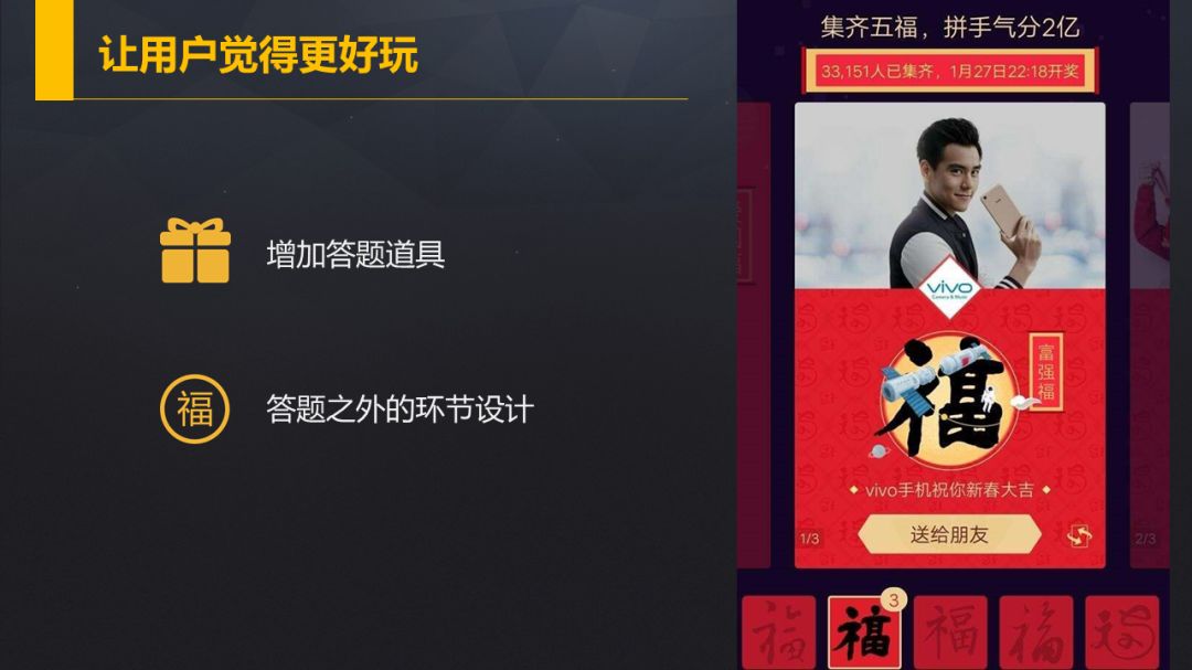 答题之外的环节设计:支付宝每年一度的“五福”大戏,相信很多人都有在参与,在过年这样的时节里,本来是支付宝的一个活跃低谷,结果因为“五福”活动,反而变成了足以和微信红包对抗的一种手段。