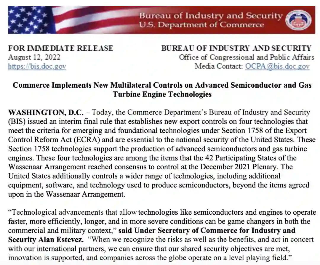 8 月 12 日,美国商务部工业和安全局(BIS)在联邦公报上发布了一项临时最终规定,将 4 项“新兴和基础技术”加入出口管制清单,其中 3 项涉及半导体,并包括芯片设计中最上游、最高端的产业 EDA。