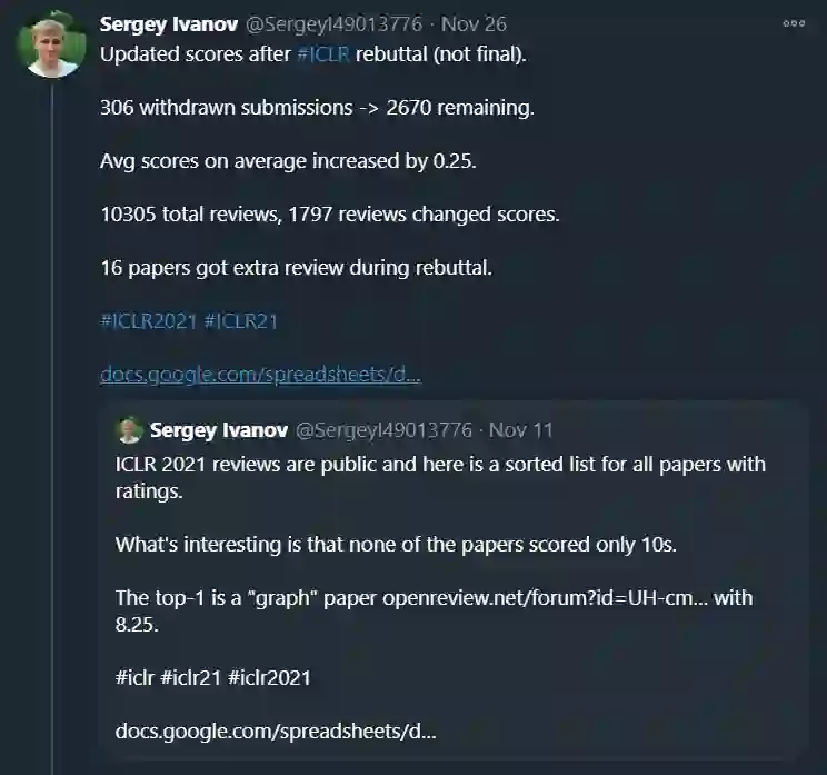在 Rebuttal 环节之后,Criteo AI Lab 研究科学家 Sergey Ivanov 在自己的推特上展示了论文评分变化的统计结果: