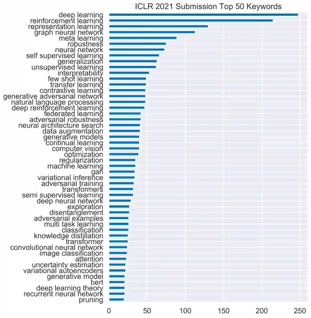 下图列举了提交论文中出现频率排名前 50 的关键词,与往年一样,深度学习、强化学习、表征学习、图神经网络都是非常热门的话题。但与去年的统计数据相比,卷积神经网络(convolutional neural network)的热度骤降,「元学习」、「表征学习」、「图神经网络」的热度均有上升。