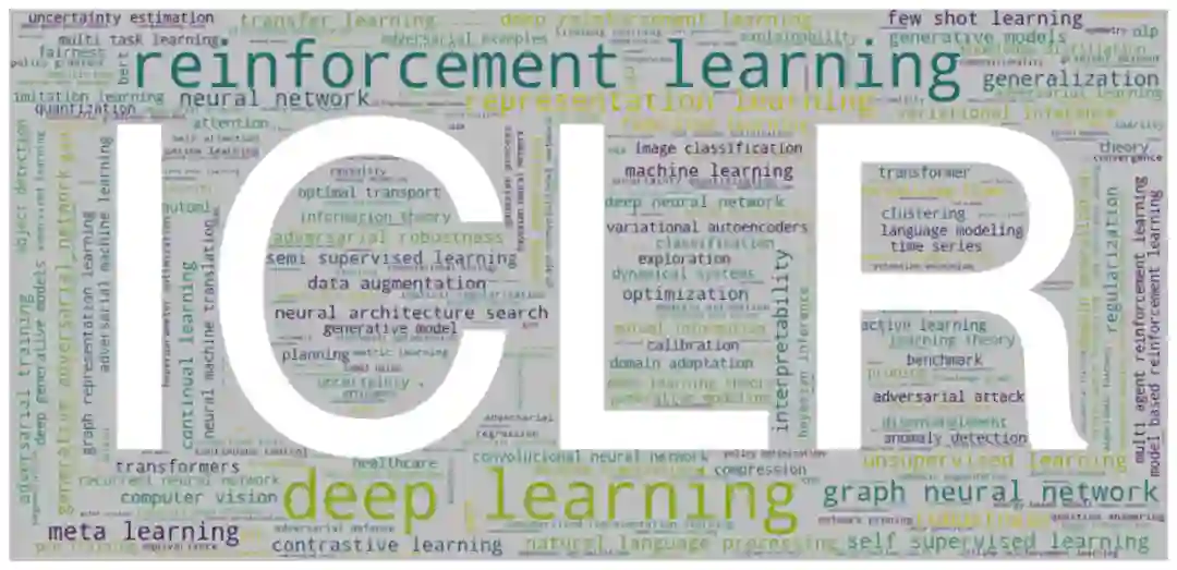 有趣的是,在名为「国际学习表征会议」的 ICLR 大会中,「表征学习」这一关键词的频率仅位于第三位,前两名的位置被「深度学习」和「强化学习」牢牢占据。