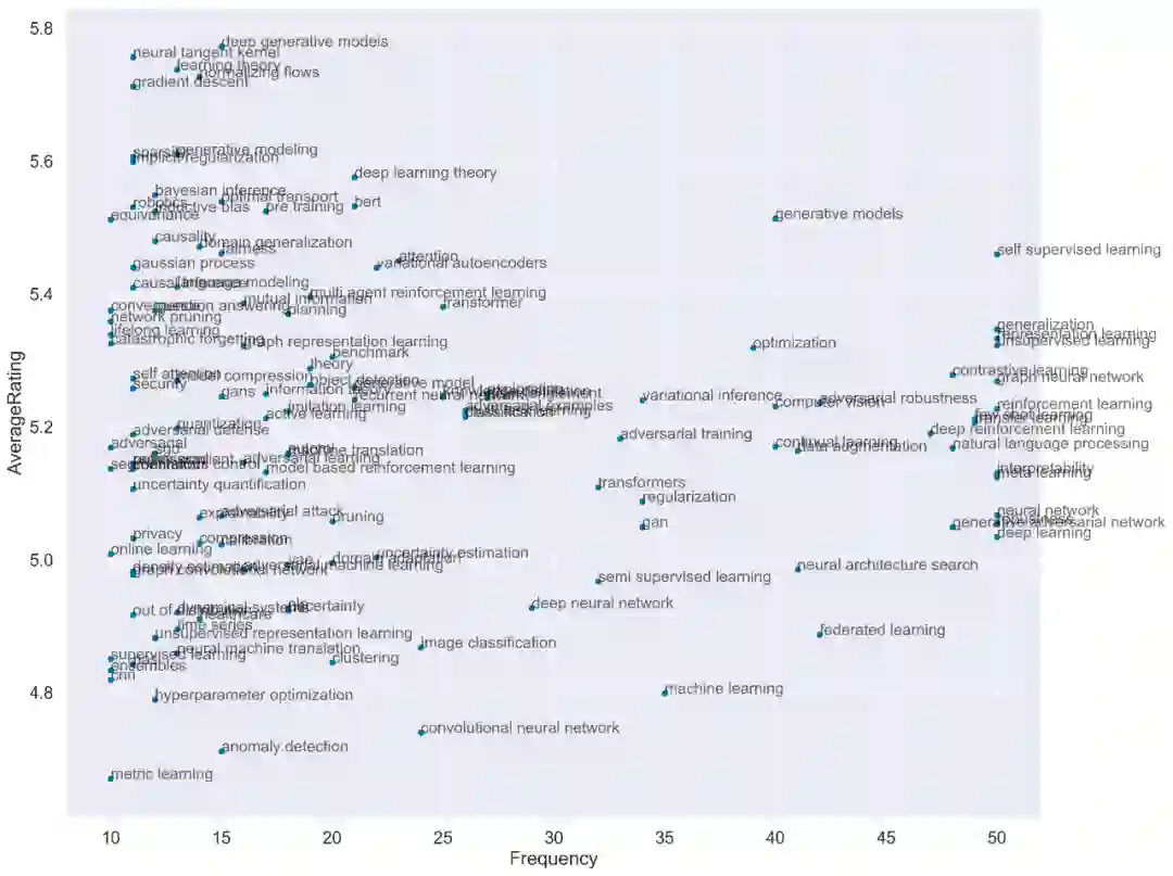 项目作者还对论文平均得分和关键词频率进行了统计。结果显示,如果论文作者希望尽可能地获得高评分,或许 ta 应该使用「深度生成模型」(deep generative models)、「归一化流」(normalizing flows)、「神经正切核」(neural tangent kernel)、「梯度下降法」(gradient descent)等关键词。