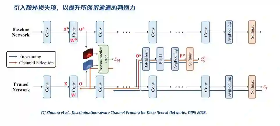 接下来,我们简单介绍这些模型压缩算法是怎样提高模型的计算效率的。第一,对通道剪枝,我们希望以更少的通道数量,最小化特征图重构损失 / 分类损失,因为如果可以保证这两个损失很小,就可以在一定程度上压缩之后的模型很大程度上接近原始模型。这是去年我们对通道剪枝做的改进,通过引入额外损失项,我们可以有效提升所保留通道的判别力(见下图)。第二,做权重稀疏化,因为很多神经网络模型中其实是有较大程度的冗余性的,去掉这部分冗余的模型参数对最终结果影响很小,而模型尺寸就可以大大降低。第三,做权重量化,我们既可以基于 PocketFlow均匀量化,也可以做非均匀量化,均匀量化就是有 N 个均匀分布的量化点,基于这种量化可以把浮点运算转换为更高效的定点运算;而非均匀量化则可以提供更高的量化自由度,从而达到更高的压缩比例。