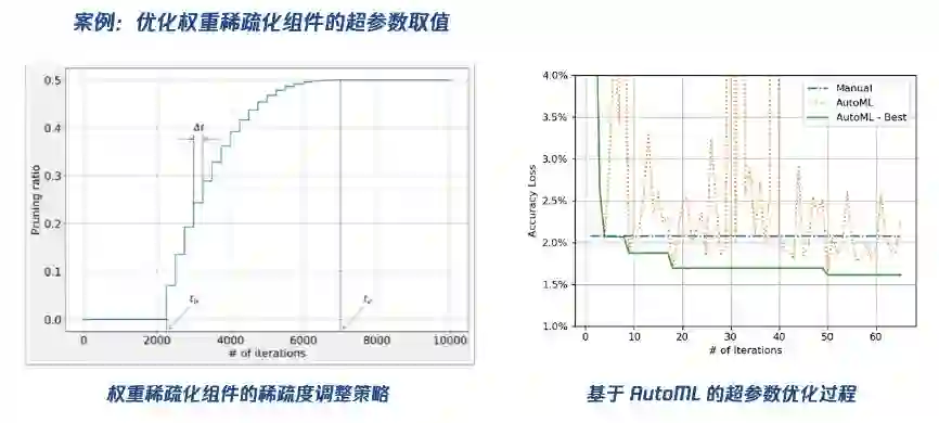 下面给出了一个具体的实验对比结果,我们通过 AutoML 算法,自动地选择权重稀疏化组建中的几个超参数取值组合。我们当然也可以基于过往经验去选择,但是需要一定的专业知识,并且可能会很耗时,因此希望这个过程可以更加自动化。从下图中可以看到,我们基于 AutoML 算法大约是在第 10 次迭代中就可以达到比手工调参更好的结果。