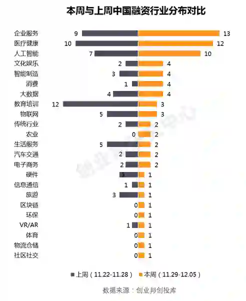 医疗健康、企业服务保持着较高的热度;人工智能也受到资本关注,本周有10起融资事件;教育培训本周遇冷,融资事件