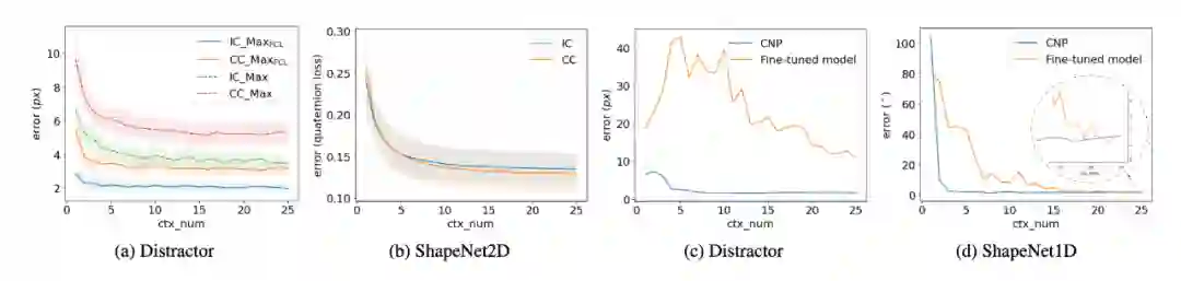 (a) 使用 Max 聚合和 Max + FCL 在 Distractor 任务中 CNP 预测误差(像素)与上下文对数的关系。包括类别内 (IC) 和跨类别 (CC) 级别的新对象的评估结果。(b) 使用 DA + TA 的 ShapeNet2D 任务中 CNP (CA) 预测误差与上下文对数的关系。(c) 我们比较了经典的目标检测方法和 CNP (Max) 在新任务上使用不同数量的数据在 Distractor 上进行训练。经典模型在每个新任务上都会进一步微调训练。(d) 微调模型与 CNP (CA) 在 ShapeNet1D 上的预测误差。