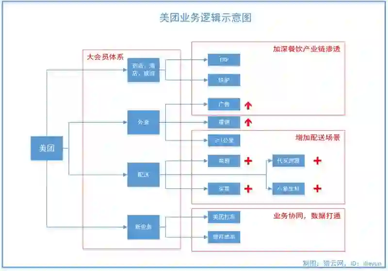 现在美团的商业逻辑变了,不再把餐饮外卖当成一个纯粹的导流入口,开始提高佣金、广告收入、商家服务等营收比重,通过外卖的各个链条来获取更多的营收。