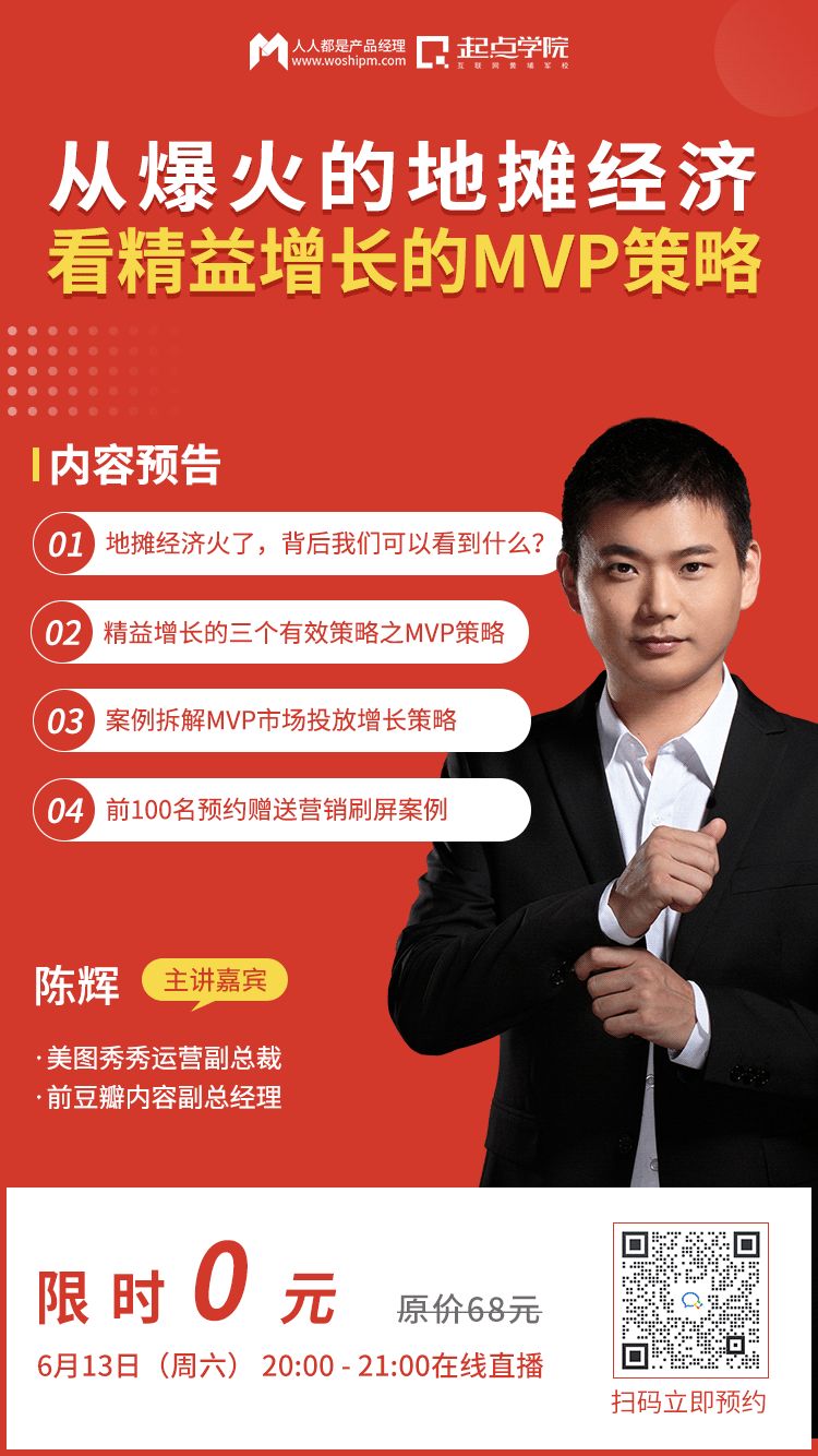 做过千万级日活产品的用户运营,实现过每日数百万的运营收入,组织过百万级的用户活动的@陈辉老师,用1小时的时间为大家拆解营销增长的MVP策略。