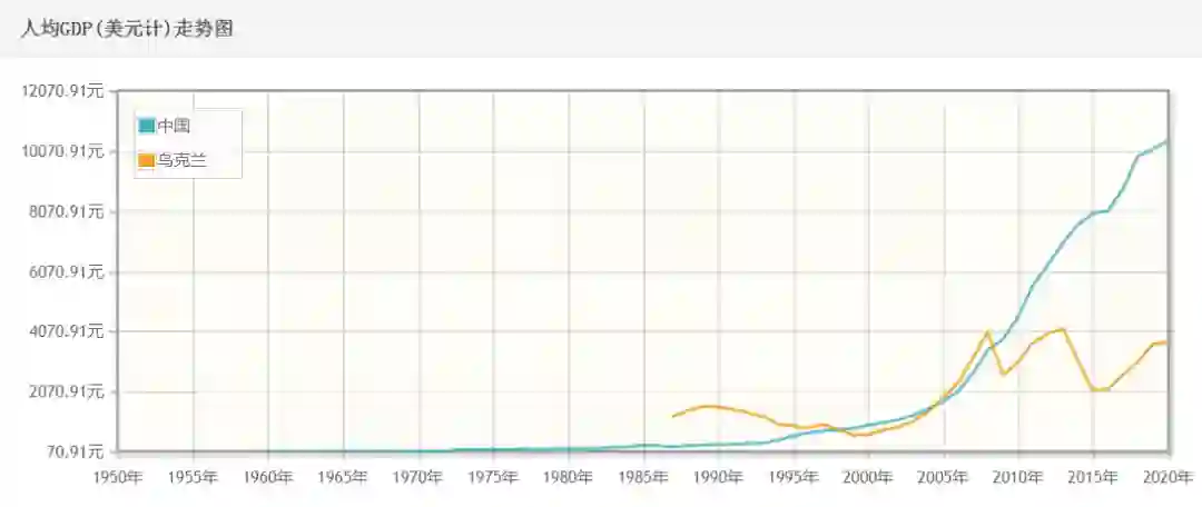 但是,30年来的独立发展过程中,乌克兰的生产总值经历了大幅上涨又迅速回落的波折变化。1990年,乌克兰的人均GDP为1568美元,而当时中国的人均GDP仅为乌克兰的1/5;到2020年,中国的人均GDP已经达到了乌克兰的3倍。2018年,乌克兰被国际货币基金组织(IMF)认证为“欧洲最穷国家”。