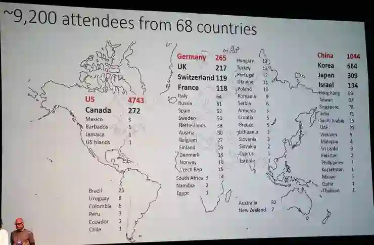 参会人数也许超出了所有人的预料,这张图在屏幕上显示出来后立刻引起了观众们的惊叹声。人数连年飞涨,仅正常注册参会、参加全部会议议程的就有 9227 人,这一数字还没有包括参展企业的相关人员。如果把会议工作人员也算上的话,一定超过一万人了。朱松纯也说道,好在有这个规模的会议场馆可以订。