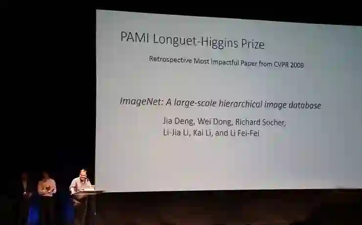 Brain Moore 颁发的第一个 PAMI 奖项是纪念 CVPR 2009 最具深远影响的论文的 PAMI Longuet-Higgins 奖,相当于其它顶会近几年开始颁发的「时间检验奖」(Test-of-Time Award)。获奖论文是计算机研究者们过于熟悉,以至于不太记得是在哪年 CVPR 上发表的李飞飞的 ImageNet 论文,但揭晓之后现场立刻响起了热烈且持久的掌声。李飞飞、李佳、李凯三人也上台领取了奖项证书。