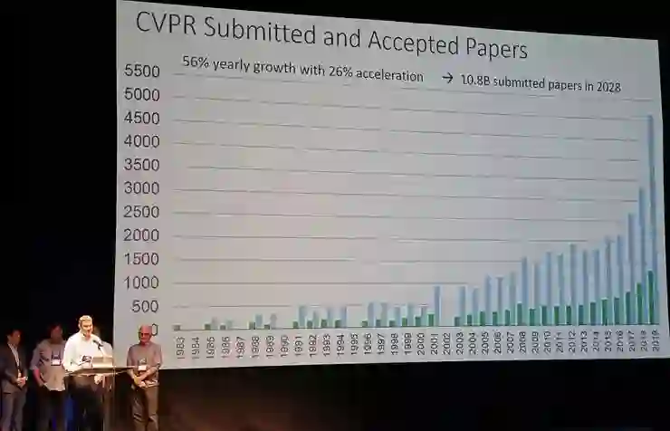 与前面朱松纯介绍的参会人数变化相符的是论文投稿数目的历年变化,Derek Hoiem 的解读是 CVPR 2019 的论文相比去年增加了 56%,增速也增加了 26%。然后就是 AI 相关领域的经典笑话时间:按照这个指数增长速度,只需要到 2028 年,CVPR 就可以收到 108 亿篇投稿,全地球平均每个人都至少有一篇论文投稿,其中包括了老人和小孩。全场哄笑。