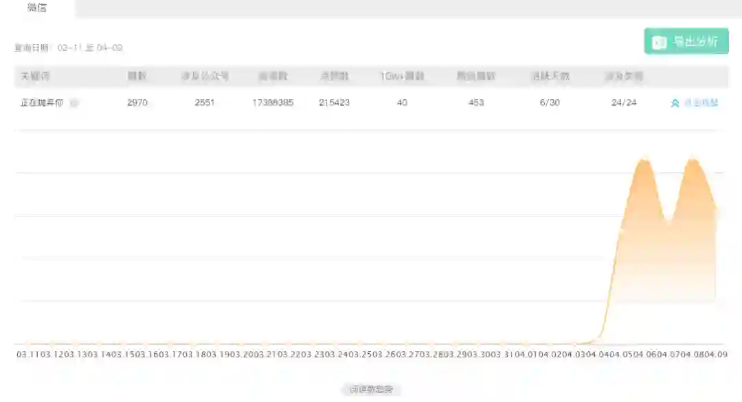 据新榜文章搜索功能显示,最近一周内,有2563篇微信文章提到包含“同龄人 正在抛弃你”等关键词的相关话题,其中至少有30篇微信文章的阅读数达到10w+。以“正在抛弃你”等关键词进行趋势查询,也能看出最近几日该话题的阅读趋势曲线呈现峰值。