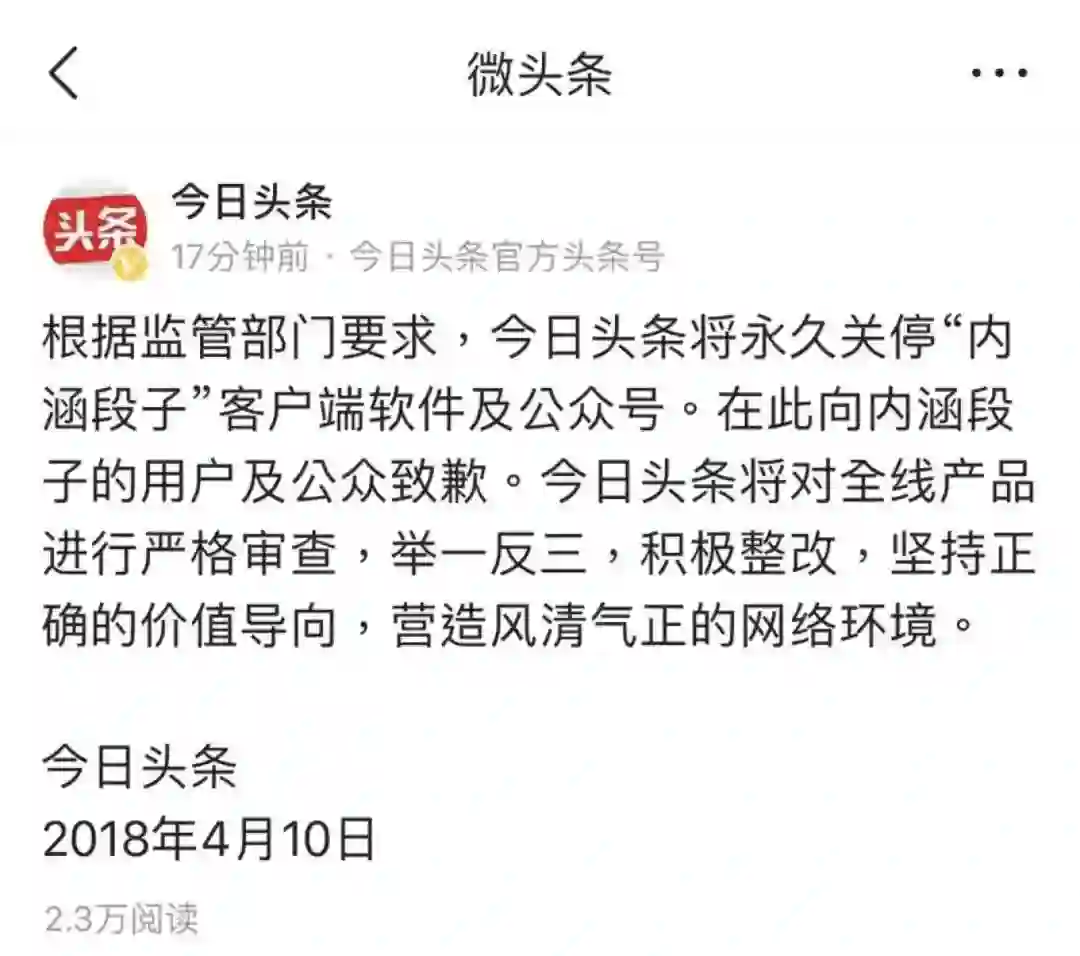 1. “内涵段子”被责令永久关停,并要求今日头条举一反三