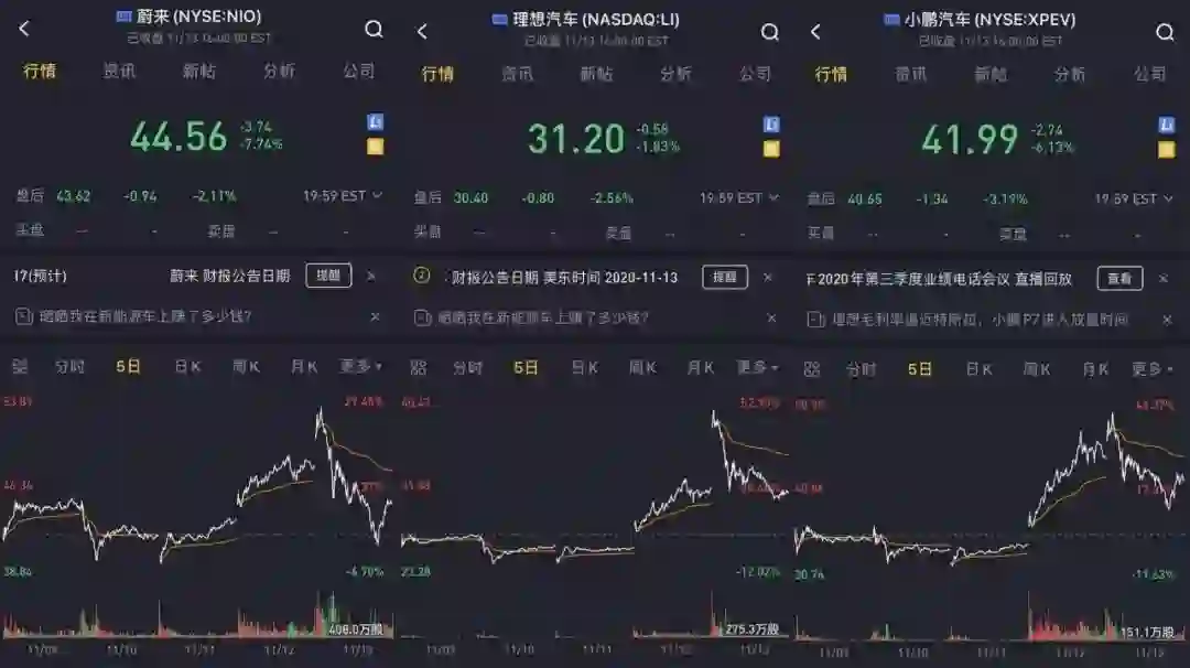 13日美股,蔚来收跌近8%,盘后继续再跌超2%,小鹏汽车收跌6.13%,盘后下挫3.19%,理想汽车收跌1.83%,盘后下挫2.56%。
