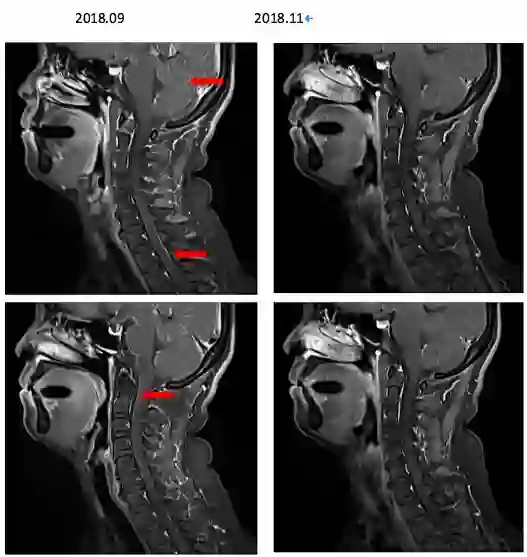 患者于2018年9月初开始出现间断头疼、失语、反应迟钝,并进行性加重,但头颅MRI(2018.09.10)脑实质未见明显转移,予以对症支持治疗。