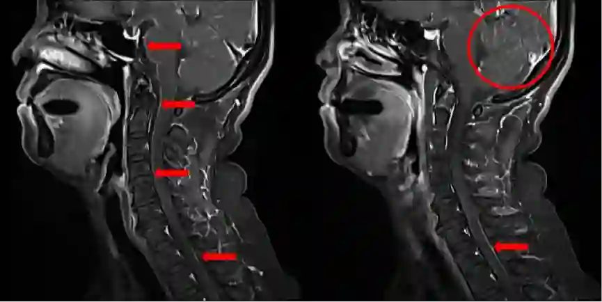 图6. 颈椎增强MRI提示脑脊膜多发转移影像