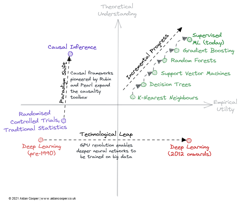 在这个框架内科学进步的最终机制是范式转变。正如托马斯 · 库恩(Thomas Kuhn)在他的著作《科学革命的结构》中所指出的,范式转变代表了科学学科的基本概念和实验实践的重要变化。Donald Rubin 和 Judea Pearl 开创的因果框架就是这样一个例子,它将因果关系领域从随机对照试验和传统统计分析提升为更强大的数学化学科,形式为因果推理。范式转变通常表现为理解的向上运动,这可能会跟随或伴随着效用的增加。