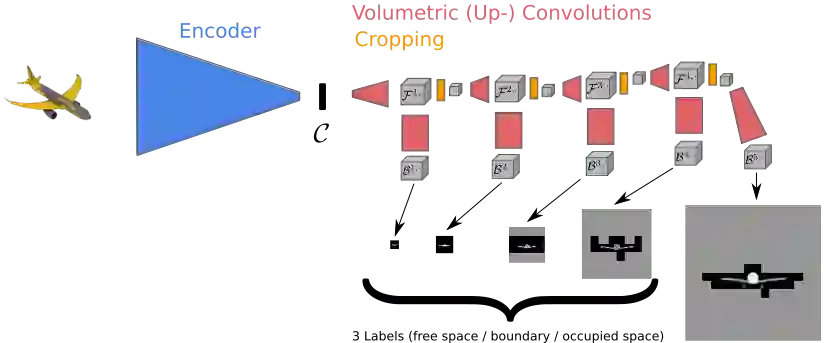 3D重建方面的一项最新工作[Choy et al. ECCV 2016, Girdhar et al. ECCV 2016]利用卷积神经网络(CNN)将物体的形状预测为一个3D体积。作为输出的3D体积被细分为体积元素,称为体素(voxel),每个体素被确定为被占用或空着(即,分别属于物体的内部或外部)。输入通常是一张彩色图片,CNN使用一个上卷积解码器架构来预测占用体积(occupancy volume)。网络被端到端地训练,并且由已知的真实占用体积进行监督,这些占用是从合成CAD模型数据集中获取的。使用这种3D表示和CNN,可以学习能够适用各种对象类的模型。