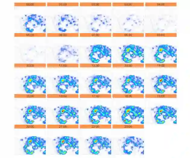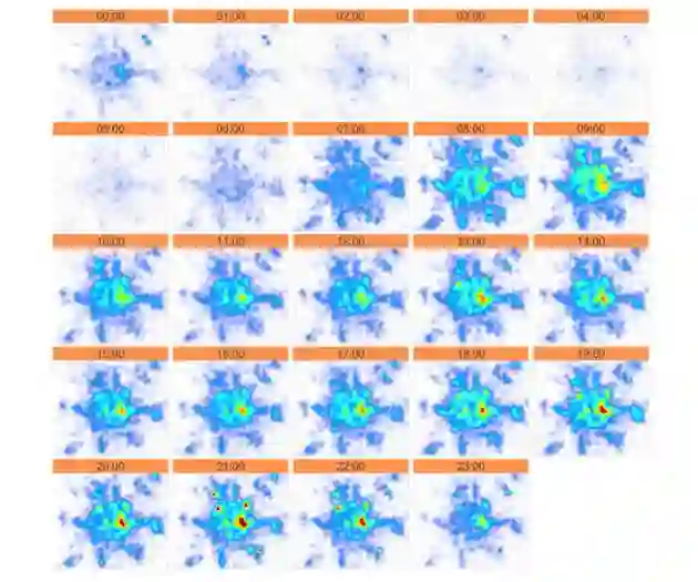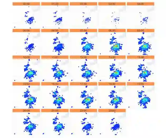 凌晨3~4点,除了机场和三里屯外,城市里绝大部分的人都还在睡梦中;清晨6点开始,人们开始上班、出行,城市逐渐苏醒;进入到白天后,国贸地区保持活跃,在城市的东部持续闪耀;而傍晚则呈现出多个中心,尤其在21点,国贸、中关村、西二旗、望京、亦庄等地的热度会短暂上升;而23点后,城市中心又回归到三里屯。
