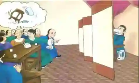 忽然抚尺一下,群响毕绝。撤屏视之,一人、一桌、一椅、一扇、一抚尺而已。
