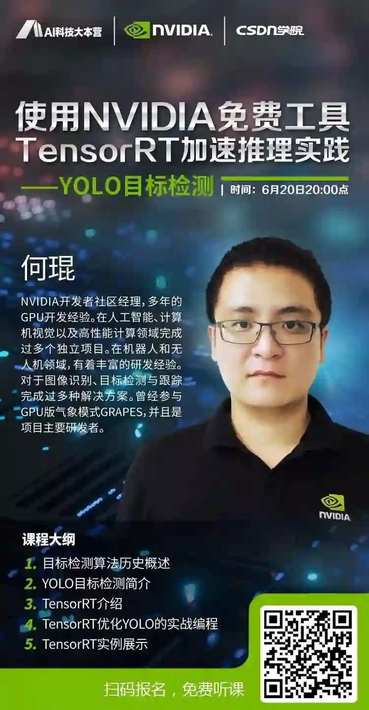 本次课程将会介绍如何利用TensorRT加速YOLO目标检测,课程将会着重介绍编程方法。本次课程还会涉及到 TensorRT 中数据类型,流处理,多精度推理等细节的展示。本次课程特色是讲解+示例分享。本次课程中,QA也是一个非常精彩的环节。