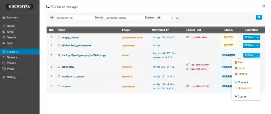 项目简介:Dockerfly 是基于 Docker1.12+ (Docker API 1.24+) 开发出 Docker 管理工具,通过 Dockerfly 的 swarm 管理你可以轻松的构建起一个基于 Docker 原生的集群系统,目的是能够方便广大 Docker 初学者以及 Docker 管理员能够快速的进行 Docker 容器的管理和维护。