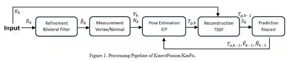 KinectFusion能够仅使用深度信息实时地对静态室内环境进行三维重建,具有五个主要的处理步骤,如图1所示,1)使用双边滤波器进行深度图细化。2)基于固有传感器矩阵的数据测量。3)ICP算法优化姿态估计。4)使用TSDF方法的表面重建。5)用于表面预测的光线投射。