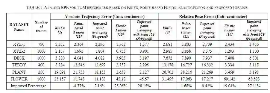 使用Kinect或Xtion等低成本商品传感器进行实时3D重建已成功应用于增强现实,机器人遥操作和医疗诊断等广泛领域。由于静态场景的假设,诸如KinectFusion、KinFu等流行的3D重建技术,发现用快速运动摄像机进行真实重建或分割运动物体是一个挑战。在本文中,我们提出了一个加权迭代最近点(ICP)算法,该算法使用深度和RGB信息来提高相机跟踪的稳定性。另外,结合深度、法线和强度等级相似性标准的基于GPU的区域生长方法也被应用于准确地分割前景移动对象。为了实现实时处理和GPU的存储效率,我们设计了基于点的表示和体表示的组合来分别重建运动对象和静态场景。定性和定量结果均表明,本文提出的方法提高了摄像机跟踪和运动目标分割的实时性,降低了计算复杂度。