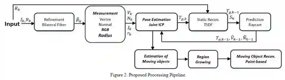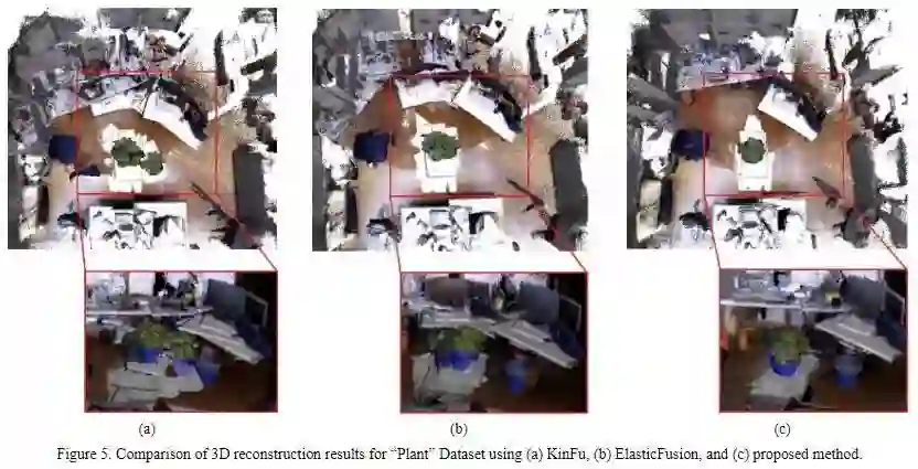为了补偿深度测量中的系统误差,我们在几何姿态估计中为每个深度值分配一个权重指示器。考虑到相机运动较快时姿态估计的误差增大,用L1范数距离代替L2范数距离,降低了光度量优化的权重比。为了解决基于点的融合问题,我们将半径图和置信度计数器扩展到三维,并结合基于点的融合和体积表示来维持重建质量水平,同时减少处理时间和内存使用。我们还包括法线和强度贴图以及深度贴图作为相似属性,以提高区域生长方法的准确性,并在GPU上实现它以保持其处理速度。然后将基于点的动态部分重建与基于体素的静态背景重建相结合。将前景移动对象同时重建并逐帧地添加到全局模型中。