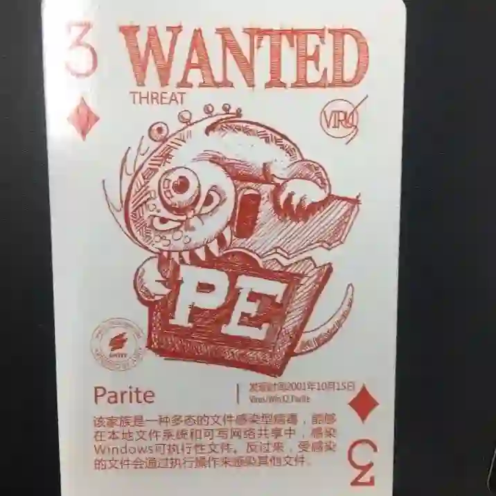大东:话说这个 Parite 病毒,你别听它的描述里一套一套的,什么“多态”啊,“文件感染型”啊,虽然它感染力极高,破坏力也不赖,但实际上它的威胁程度低,影响的平台为 Windows 95、Windows 98、Windows NT、Windows 2000、Windows XP 这类比较老的操作系统,现在也没啥人用了。