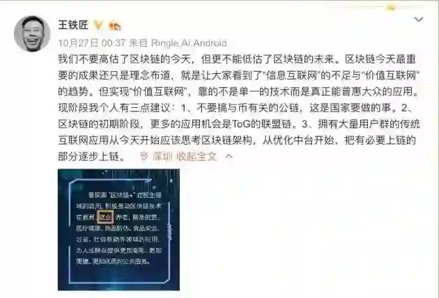 10月28日消息,快播创始人、深圳云歌人工智能科技有限公司创始人兼CEO王欣今日凌晨在微博发文,谈及对区块链的理解,他认为,“我们不要高估了区块链的今天,但更不能低估了区块链的未来。”