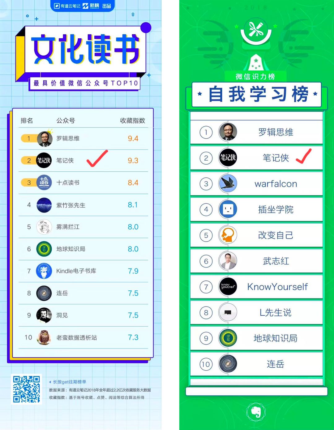 (有道云笔记“微信价值排行榜”2018年总榜第4名,印象笔记“2018公众号Top10”第3名)