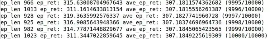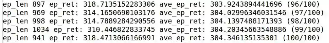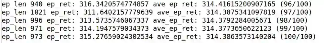 训练时保存AverageTestEpRet得分最高的模型即可。我们训练好的模型保存在createamind/DRL/saved_models中,跑sac1_test.py脚本即可看Test的效果。