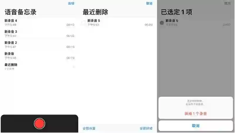 和原生相册一样,语音备忘录里被删除的整条录音,都保留在“最近删除”,点击可以选择恢复或者彻底删除。