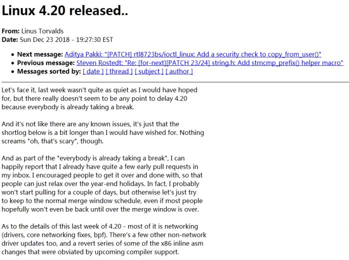 Linus Torvalds 在圣诞前夕释出了 Linux 4.20。他在内核开发者邮件列表上祝贺圣诞或其它节日“Have a Merry Christmas or other holiday of your choice”。