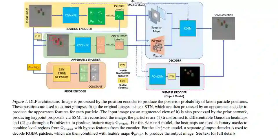 我们提出了一种新的可视化数据表示方法,将对象的位置从外观中分离出来。我们的方法被称为深度隐式粒子(Deep Latent Particles, DLP),将视觉输入分解为低维潜伏“粒子”,其中每个粒子都由其空间位置及其周围区域的特征来描述。为了推动对这种表示的学习,我们遵循了一种基于虚拟空间的方法,并引入了基于空间-softmax架构的粒子位置先验,以及由粒子之间的倒角距离启发的证据下限损失修正。我们证明了我们的DLP表示对于下游任务是有用的,如无监督关键点(KP)检测,图像操作,以及由多个动态对象组成的场景的视频预测。此外,我们展示了我们对问题的概率解释自然地提供了粒子位置的不确定性估计,这可以用于模型选择等任务。视频和代码: