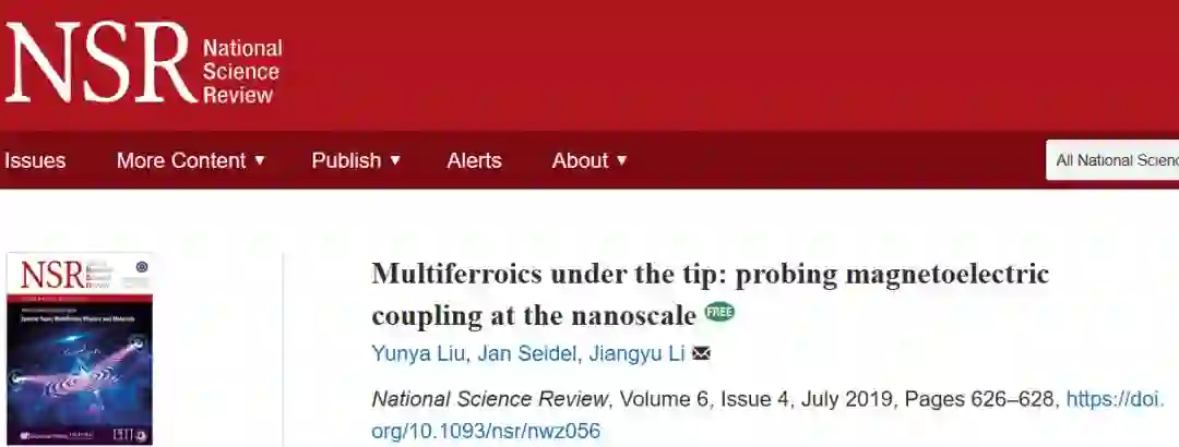 近日,中国科学院深圳先进技术研究院医工所纳米调控与生物力学研究中心李江宇研究员应清华大学南策文院士和南京大学刘俊明教授的邀请,联合湘潭大学刘运牙教授、澳大利亚新南威尔士大学Jan Seidel教授在国际一流多学科综合性期刊National Science Review(国家科学评论,影响因子13.222)发表题为Multiferroics under the tip: probing magnetoelectric coupling at the nanoscale(针尖下的多铁:纳米尺度磁电耦合的探测)的前瞻展望性文章,对该领域研究进展做了点评,发展趋势做了展望。李江宇为论文的通讯作者。