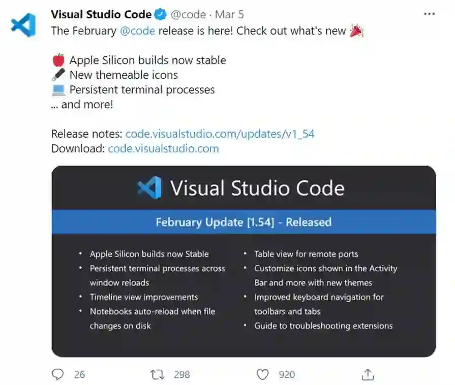 对于新发布的 VS Code1.54.1 版本,网友表示:「终于等到了支持苹果 M1 Mac 的稳定版 VS Code」。