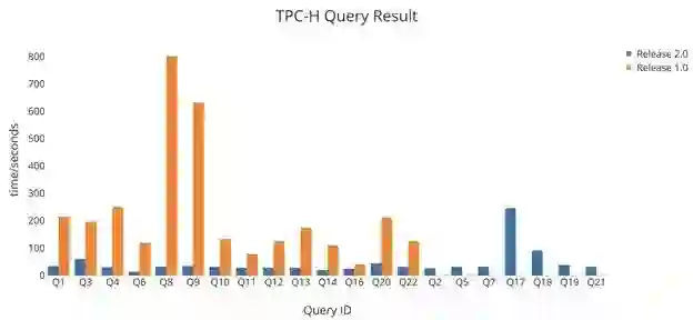 完成上述两项改动之后,TiDB 在 OLAP 场景下的性能有了大幅的质的提升,从 TPC-H 的对比结果来看,所有的 Query 在 2.0 中都运行得更快,一些 Query 大多数都有几倍甚至数量级的提升,特别是一些 1.0 中跑不出结果的 Query 在 2.0 中都能顺利执行。